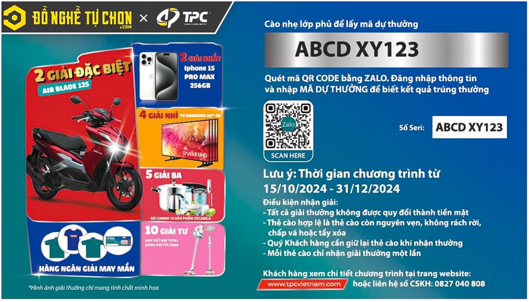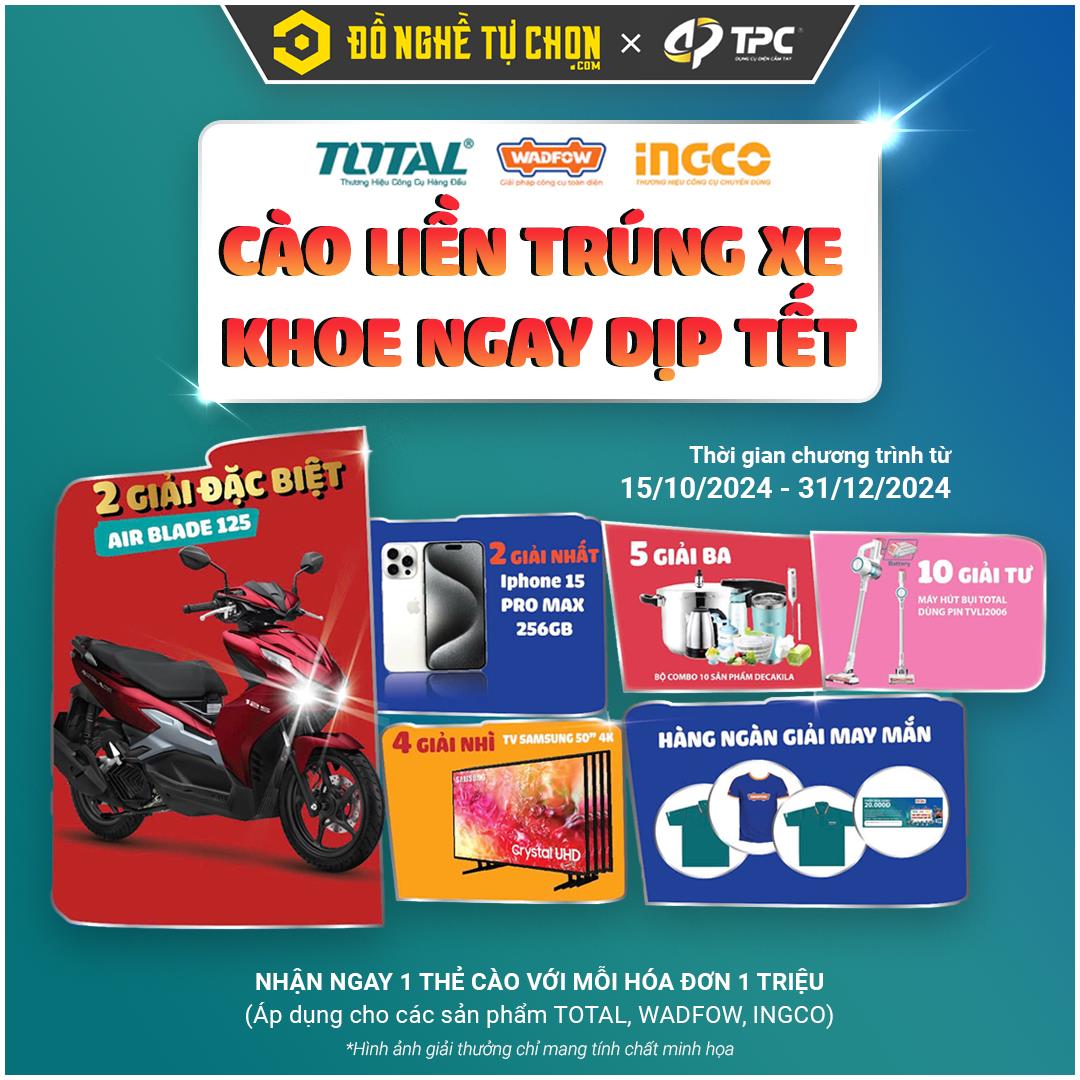Mùa Tết 2025 đang đến rất gần, mang theo không khí rộn ràng và niềm vui sum vầy của những ngày cuối năm. Để cùng Quý khách hàng đón một mùa Tết thêm phần phấn khởi, Công ty TNHH TM DV TPC kết hợp cùng Siêu Thị Đồ Nghề Tự Chọn hân hạnh giới thiệu chương trình khuyến mãi cực kỳ hấp dẫn “Cào Liền Trúng Xe – Khoe Ngay Dịp Tết”. Đây là cơ hội đặc biệt để bạn không chỉ mua sắm những sản phẩm chất lượng mà còn có cơ hội sở hữu những phần quà giá trị, giúp mùa Tết này thêm trọn vẹn niềm vui!