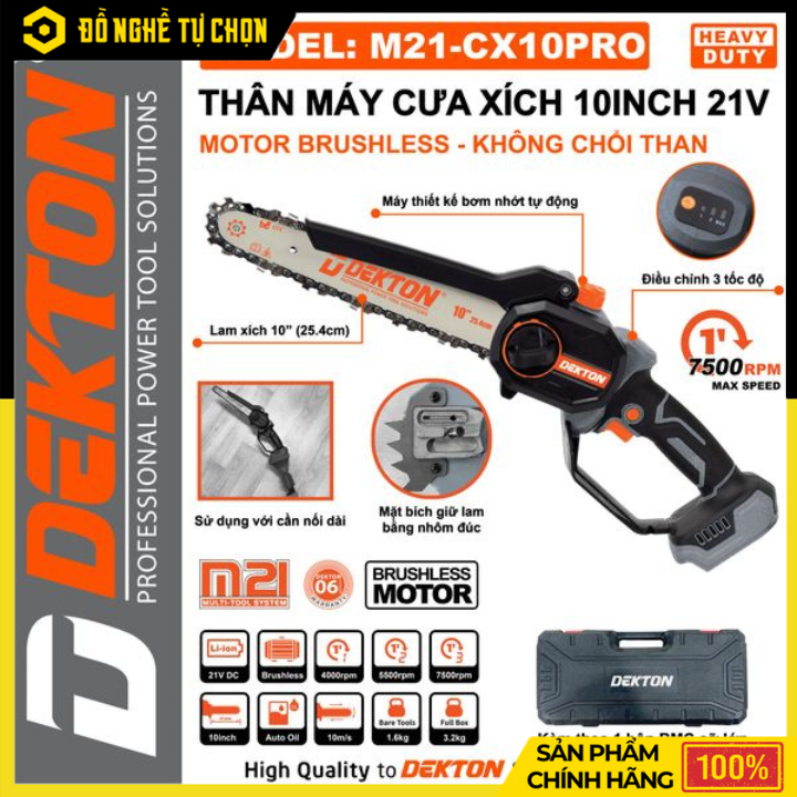 Trong phân khúc đó, DEKTON M21-CX10PRO là mẫu cưa xích pin được nhiều thợ và người dùng gia đình quan tâm nhờ sự cân bằng tốt giữa hiệu suất – độ bền – tính linh hoạt.