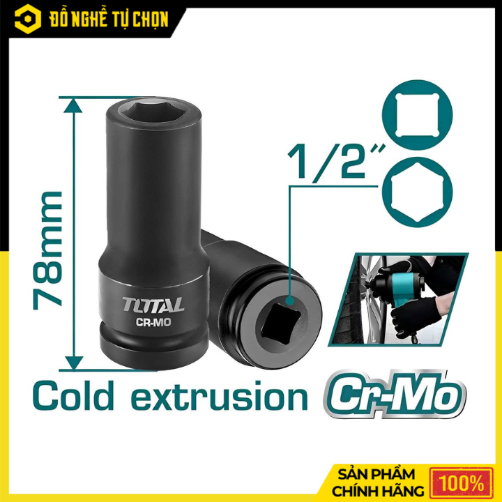 Đầu tuýp 24mm 1/2" Total THDIS12241L là phụ kiện không thể thiếu cho các công việc siết mở bu lông, đai ốc cỡ lớn trong sửa chữa cơ khí, ô tô – xe máy và thi công công trình. Sản phẩm được chế tạo từ thép Cr-Mo cao cấp, cho khả năng chịu lực tốt, hạn chế biến dạng khi làm việc với lực siết lớn, đặc biệt phù hợp khi sử dụng cùng súng vặn hoặc cần siết 1/2 inch.