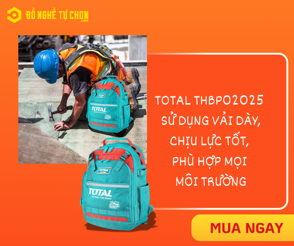 TOTAL THBP02025 là dòng ba lô chuyên dụng cho thợ, phù hợp mang theo các dụng cụ cầm tay, phụ kiện, đồ nghề sửa chữa khi di chuyển nhiều, làm việc hiện trường hoặc thi công trên cao.