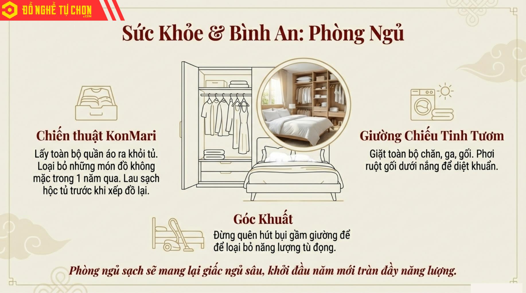 🛏️ 4. Phòng ngủ & tủ quần áo – dọn để bỏ cái cũ, đón cái mới