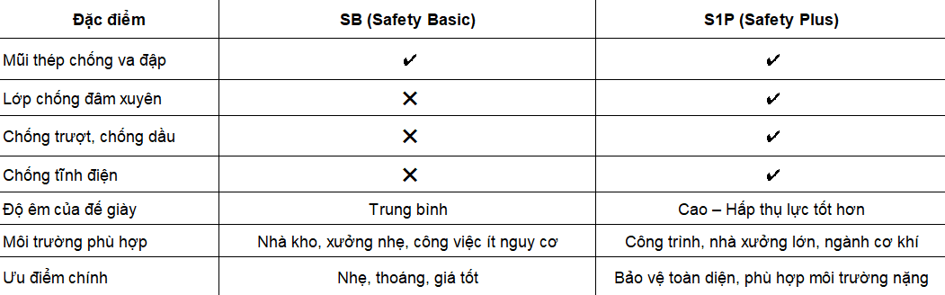 Còn nếu bạn thường xuyên ra công trình, làm cơ khí, xây dựng hoặc môi trường có nhiều nguy cơ như vật sắc nhọn, sàn trơn, điện tĩnh, dầu nhớt... thì hãy đầu tư ngay đôi S1P. Dù nặng hơn một chút và giá cao hơn, nhưng đổi lại bạn sẽ có được sự an tâm tuyệt đối trong công việc hàng ngày.