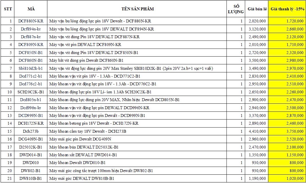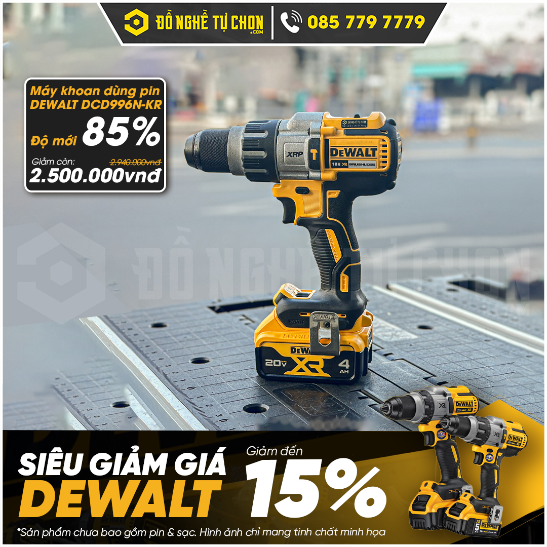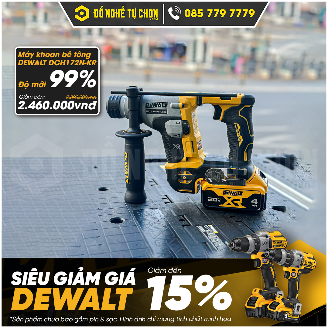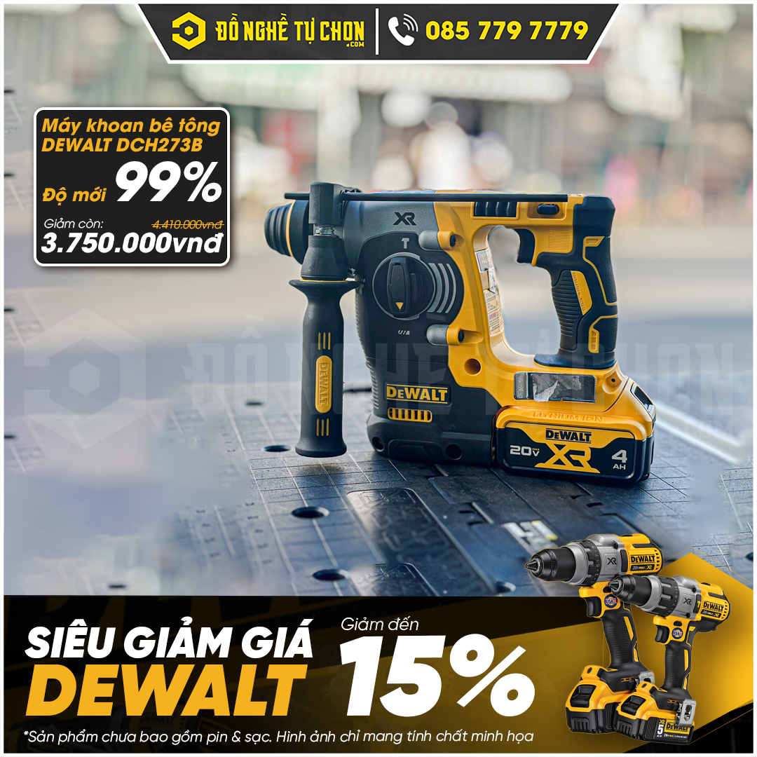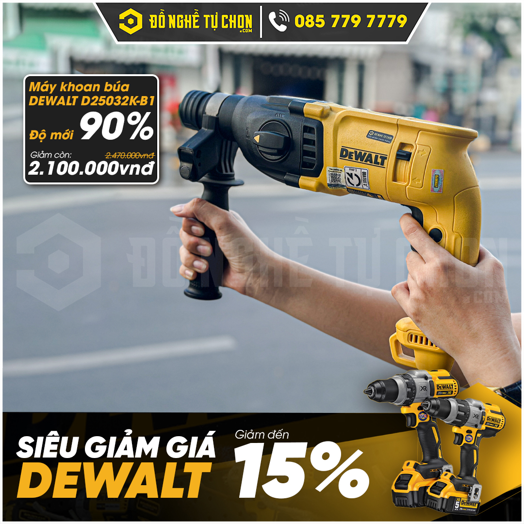 Đồ Nghề Tự Chọn giảm ngay 15% cho toàn bộ các sản phẩm Dewalt đang trưng bày tại Showroom. Số lượng có hạn và mỗi mã sản phẩm chỉ có 1 máy duy nhất. Dưới đây là danh sách sản phẩm đầy đủ đang áp dụng ưu đãi và giá chi tiết cho từng sản phẩm.