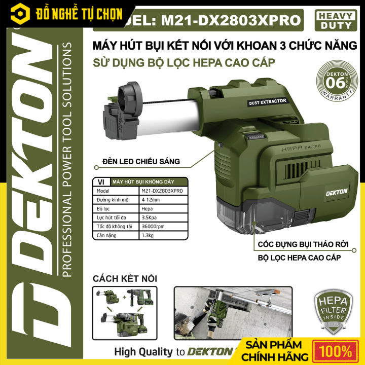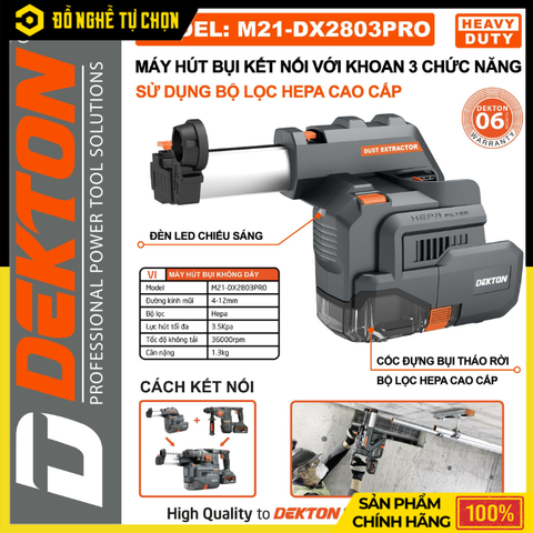 Máy Hút Bụi Dùng Cho Máy Khoan Dekton M21-DX2803PRO – Tích Hợp Cho Khoan Bê Tông, Lực Hút Mạnh, Bộ Lọc HEPA Cao Cấp - Hàng Chính Hãng, Có VAT