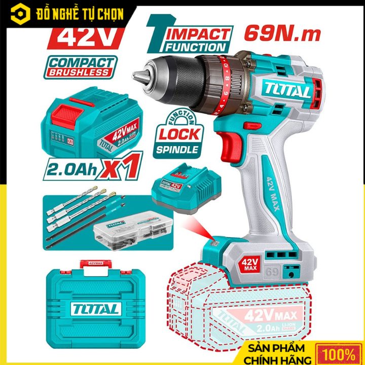 TOTAL TIDLI426981 là dòng máy khoan búa dùng pin cao cấp, tích hợp công nghệ động cơ không chổi than (Brushless) giúp vận hành mạnh mẽ, ổn định và bền bỉ hơn hẳn các dòng truyền thống. Với nguồn pin 42V cùng mô-men xoắn 69Nm, sản phẩm phù hợp cho cả thợ chuyên nghiệp lẫn người dùng DIY cần một thiết bị khoan – bắt vít toàn diện.