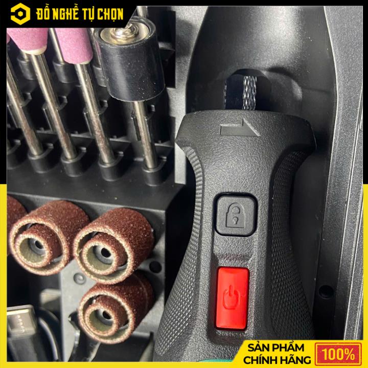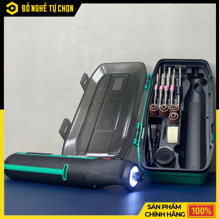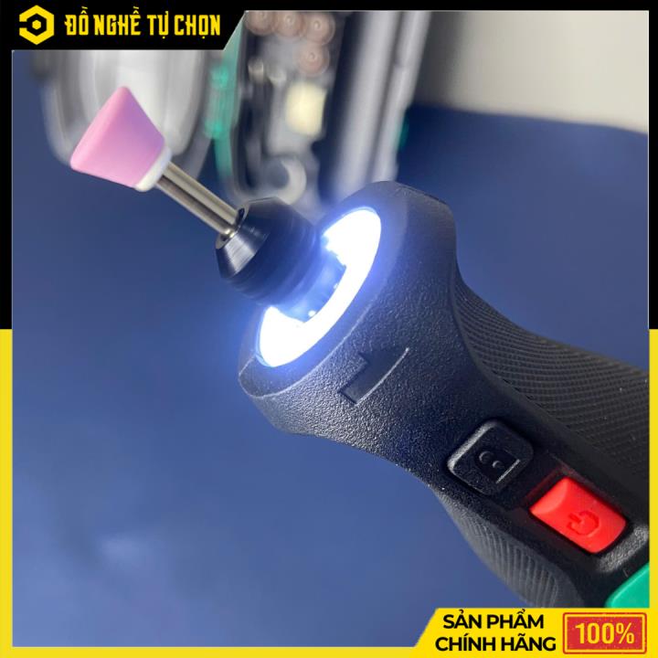 Máy sử dụng pin 8V/0.9Ah, công suất đầu ra tối đa 64W, cho hiệu suất ổn định và linh hoạt. Trang bị 5 cấp tốc độ điều chỉnh từ 6000 đến 28000 vòng/phút giúp người dùng dễ dàng lựa chọn mức phù hợp với từng vật liệu và mục đích sử dụng.
