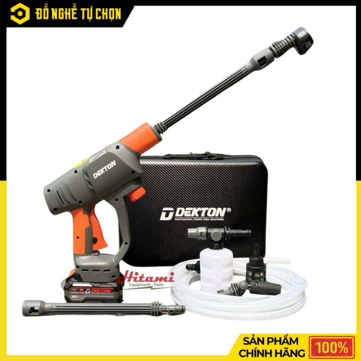 Máy sử dụng pin 21V hệ M21 Dekton, mang lại tính cơ động cao, không phụ thuộc nguồn điện, đặc biệt phù hợp cho rửa xe tại nhà, sân vườn hoặc thợ dịch vụ di động.