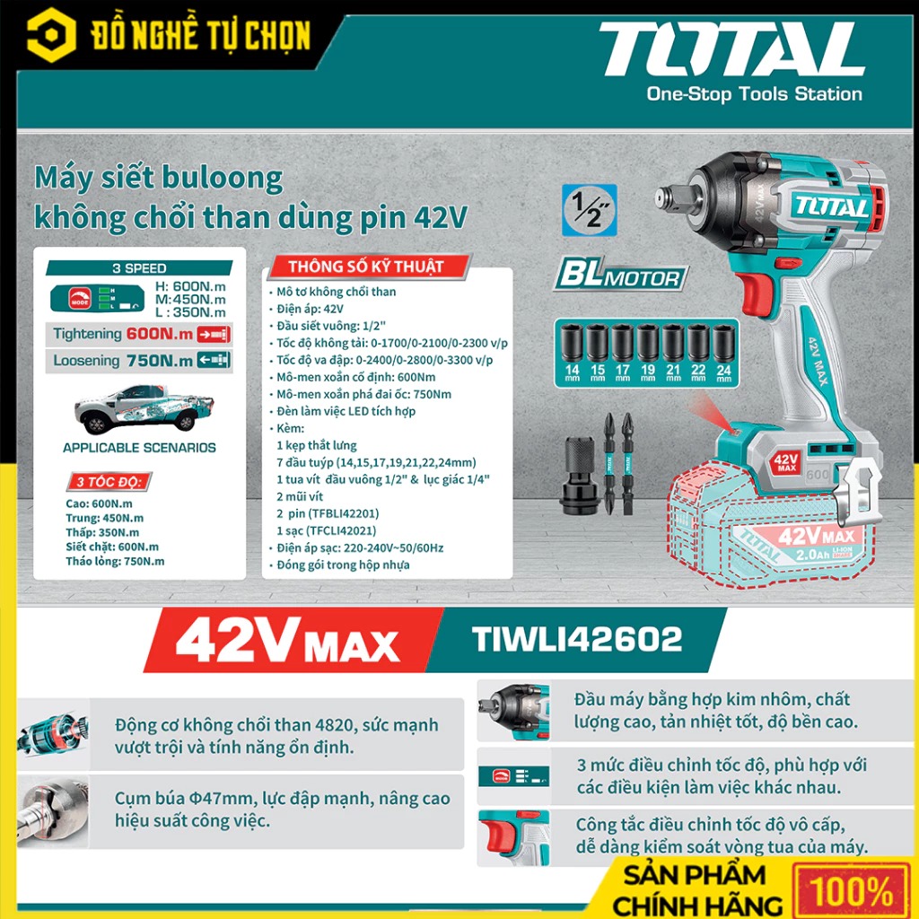 TOTAL TIWLI42602 là thiết bị chuyên dụng giúp tháo lắp bulong nhanh chóng và mạnh mẽ, sử dụng pin 42V hiệu suất cao kết hợp motor không chổi than cho tuổi thọ vượt trội.