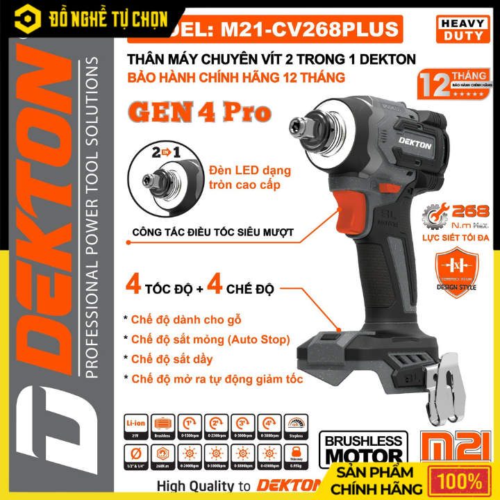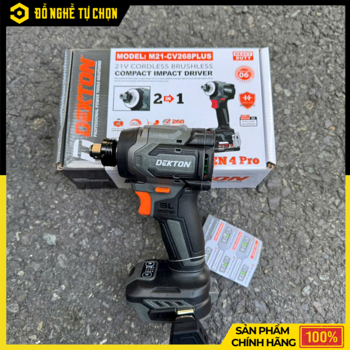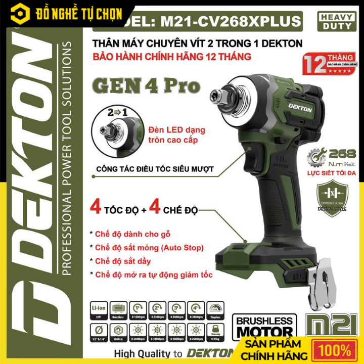 Máy siết bu lông Dekton M21-CV268PLUS là dòng máy không chổi than mạnh mẽ, chuyên dùng cho sửa chữa xe, cơ khí, công trình và dân dụng. Thiết kế nhỏ gọn, lực siết khỏe, độ bền cao – phù hợp cho cả thợ chuyên và người dùng gia đình.