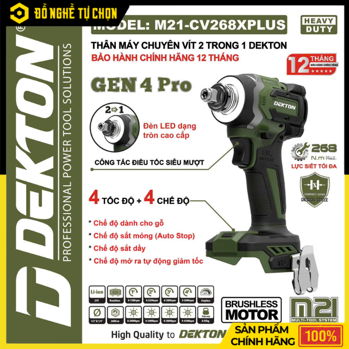 Máy chuyên vít Dekton Zen 4 M21-CV268XPLUS là dòng máy bắt vít thế hệ thứ 4 với động cơ không chổi than mạnh mẽ, mô-men xoắn tối đa 268Nm. Máy được thiết kế đầu gài 2 trong 1 tiện lợi, có thể sử dụng cả đầu khẩu và mũi vít trực tiếp. Sản phẩm tích hợp 4 tốc độ và 4 chế độ thông minh giúp tối ưu hiệu suất khi làm việc với gỗ, sắt mỏng hoặc sắt dày. Thiết kế gọn gàng, công tắc điều tốc mượt và đèn LED siêu sáng giúp người dùng làm việc hiệu quả trong nhiều điều kiện khác nhau.