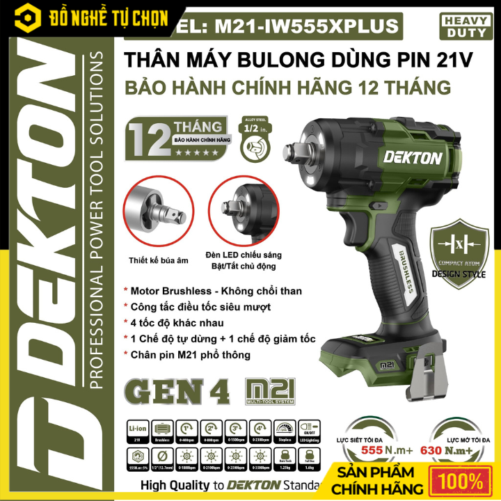 Thân Máy Siết Bu Lông Pin 21V Dekton M21-IW555XPLUS – 555Nm, Brushless, Đầu 1/2 Inch, 4 Tốc Độ | Hàng Chính Hãng, Có VAT