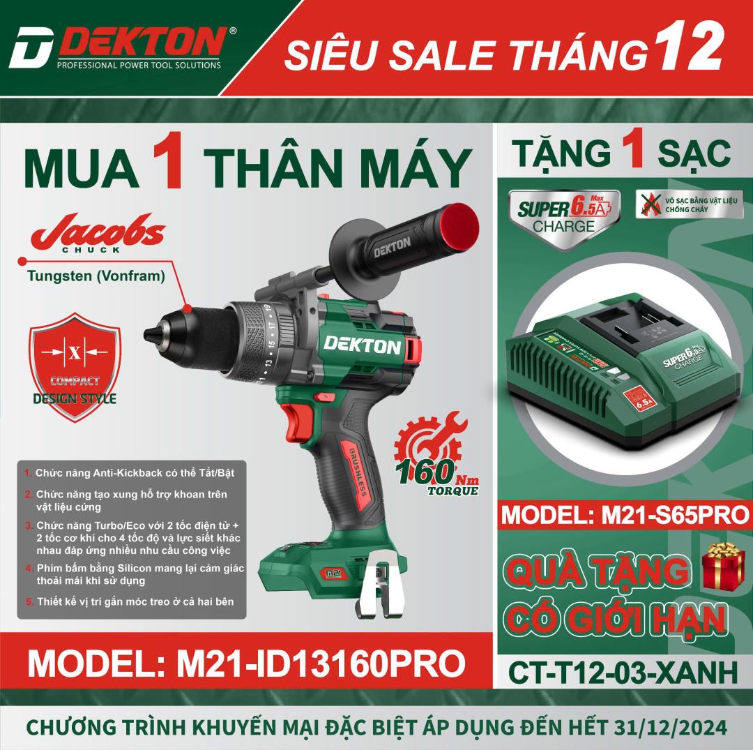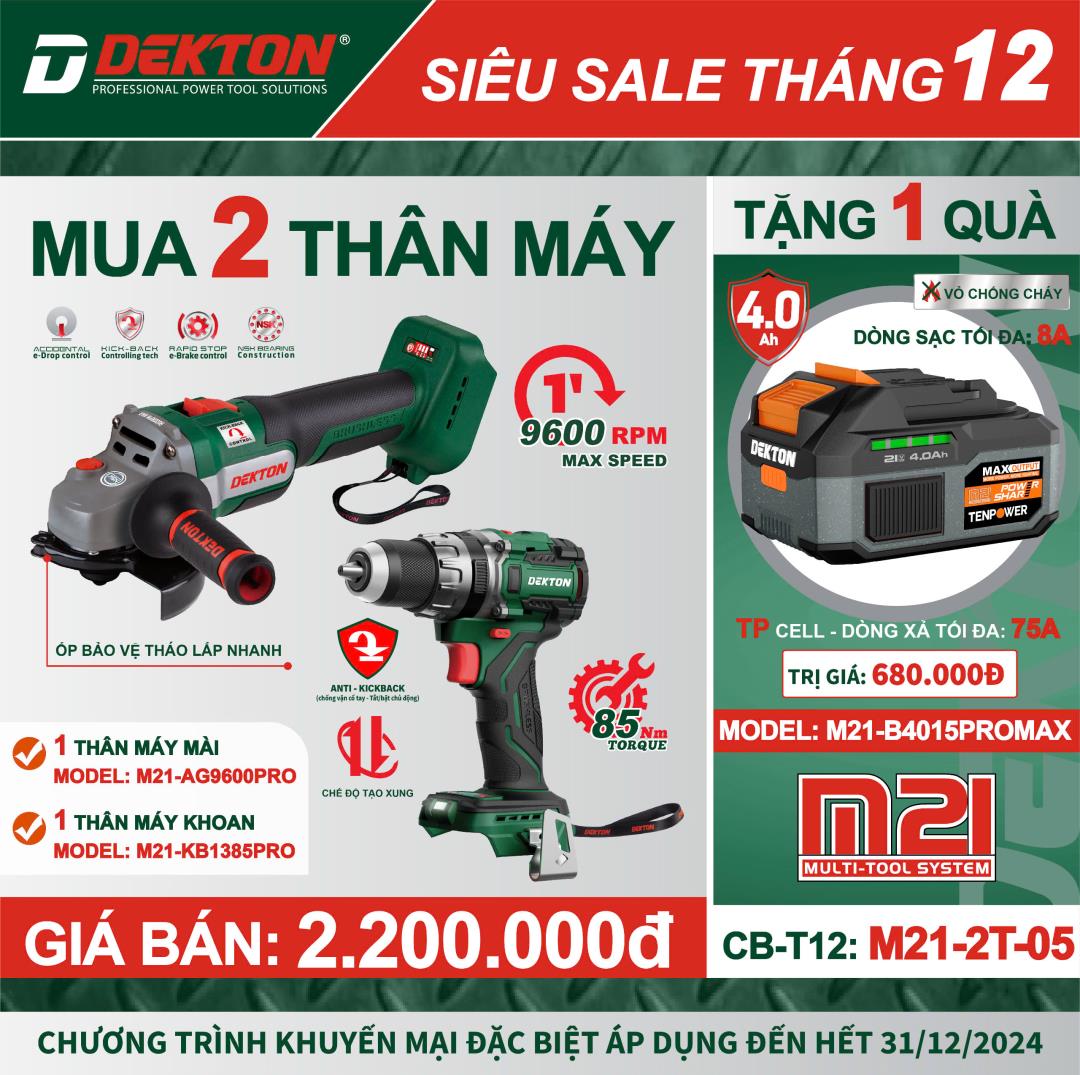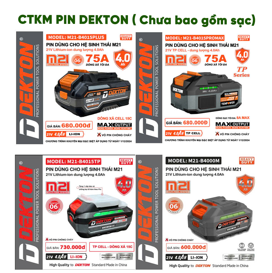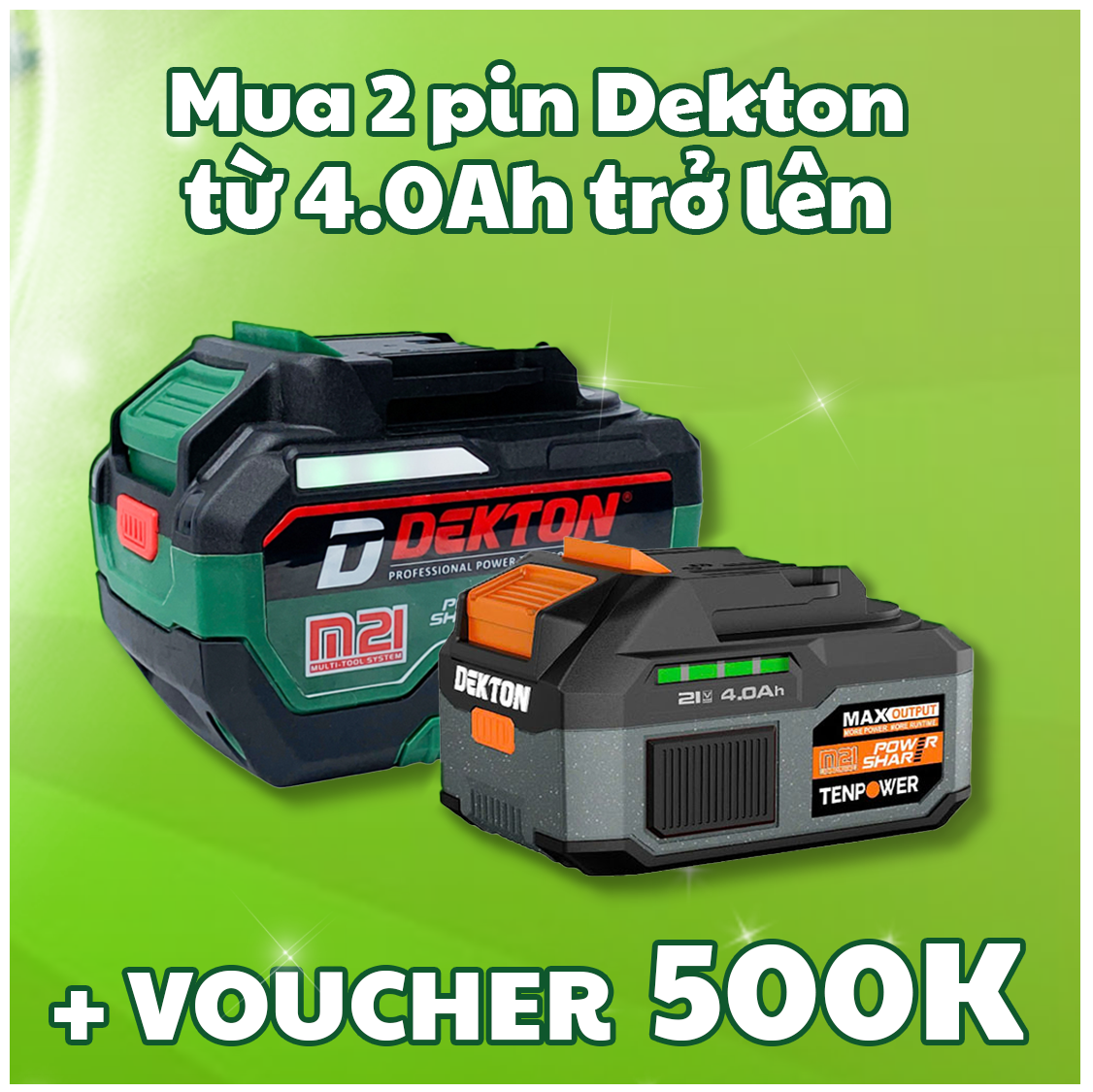 Đặc biệt nhất, khi quý khách mua 2 pin Dekton bất kỳ từ 4Ah trở lên, quý khách sẽ được tặng ngay Voucher siêu khủng lên đến 500.000đ cho lần mua hàng tiếp theo.