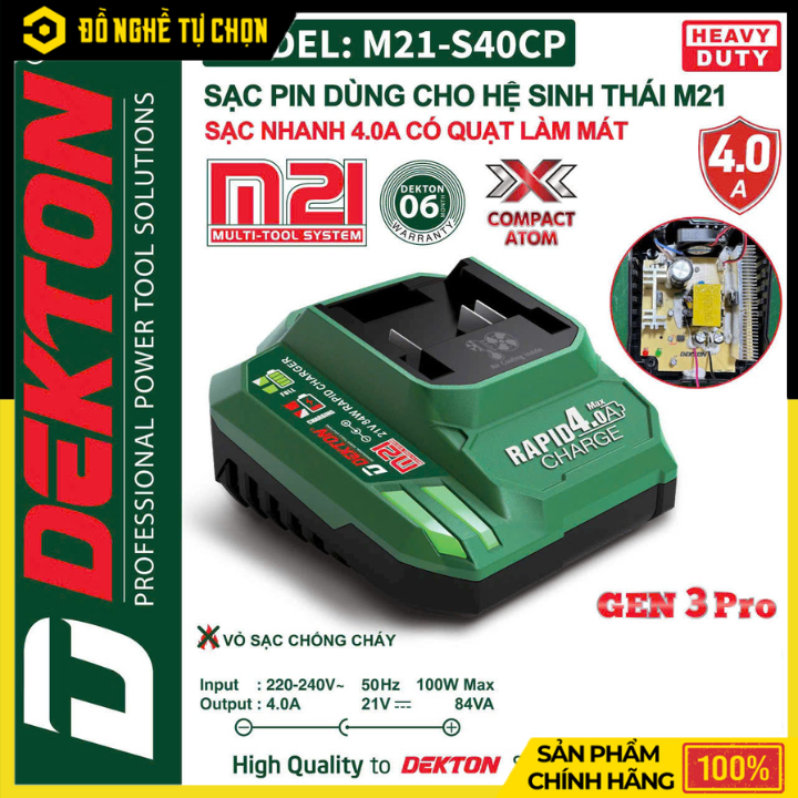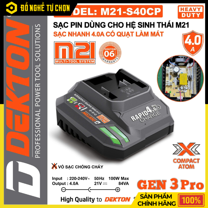 Đế sạc nhanh 4.0Ah Dekton M21-S40CP Gen 3 Compact Atom là giải pháp tối ưu dành cho người dùng cần sạc pin nhanh, hiệu quả và an toàn. Được trang bị công nghệ sạc nhanh thế hệ 3 cùng hệ thống quạt tản nhiệt, thiết bị giúp pin được nạp đầy trong thời gian ngắn mà vẫn đảm bảo độ bền và an toàn tuyệt đối.