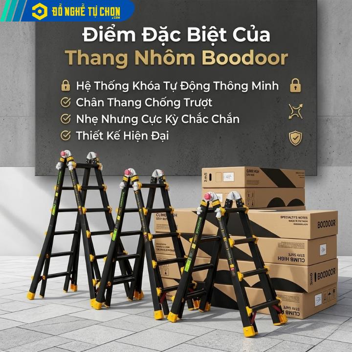 Bạn đang tìm kiếm một chiếc thang nhôm chắc chắn, gọn nhẹ, dễ sử dụng và an toàn cao? Thang nhôm Boodoor chính là lựa chọn lý tưởng dành cho gia đình, cửa hàng, nhà xưởng và công trình chuyên nghiệp. Với thiết kế thông minh, đạt chuẩn quốc tế và được người tiêu dùng Việt tin tưởng, Boodoor ngày càng khẳng định vị thế là dòng thang nhôm chất lượng cao đáng đầu tư.