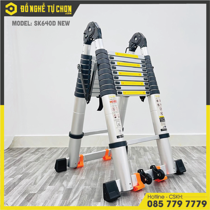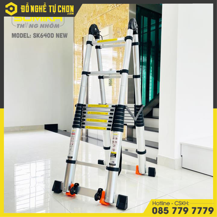 Thang nhôm rút đôi chữ A SUMIKAModel: SK640D NEW- Kích thước: 52x21x105cm- Thang rút có khóa gấp tự động.- Chiều cao tối đa chữ A: 3.2m- Chiều cao tối đa duỗi thẳng (chữ I): 6.4m- Chiều cao rút gọn: 101cm- Trọng lượng: 24.4kg- Số bậc: 2×10 bậc- Độ dày nhôm: 1,3-1,5mm- Chất liệu: Hợp kim nhôm- Chiều dài ống nhôm: 45cm - 60cm- Tải trọng 300kg.- Đạt tiêu chuẩn EN131.- Đế cao su chống trượt: Thanh ngang có 4 đế cao su chắc chắn.