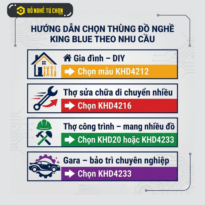 Nếu bạn đang tìm kiếm dòng thùng đồ nghề bền bỉ – tiện lợi – giá hợp lý, thì King Blue chính là lựa chọn đáng cân nhắc. Hiện nay, Đồ Nghề Tự Chọn (DNTC) đang cung cấp nhiều mẫu thùng đồ nghề King Blue chính hãng, phù hợp cho thợ điện, cơ khí, điện lạnh, bảo trì và người dùng gia đình.