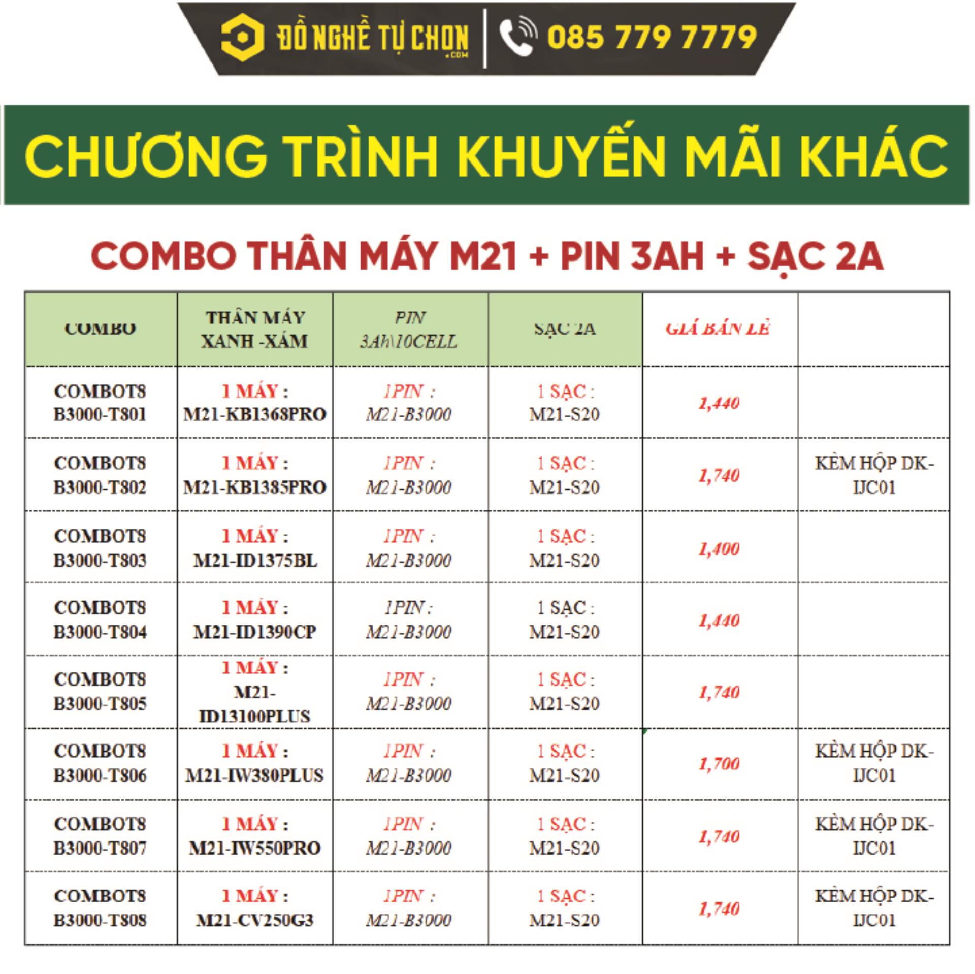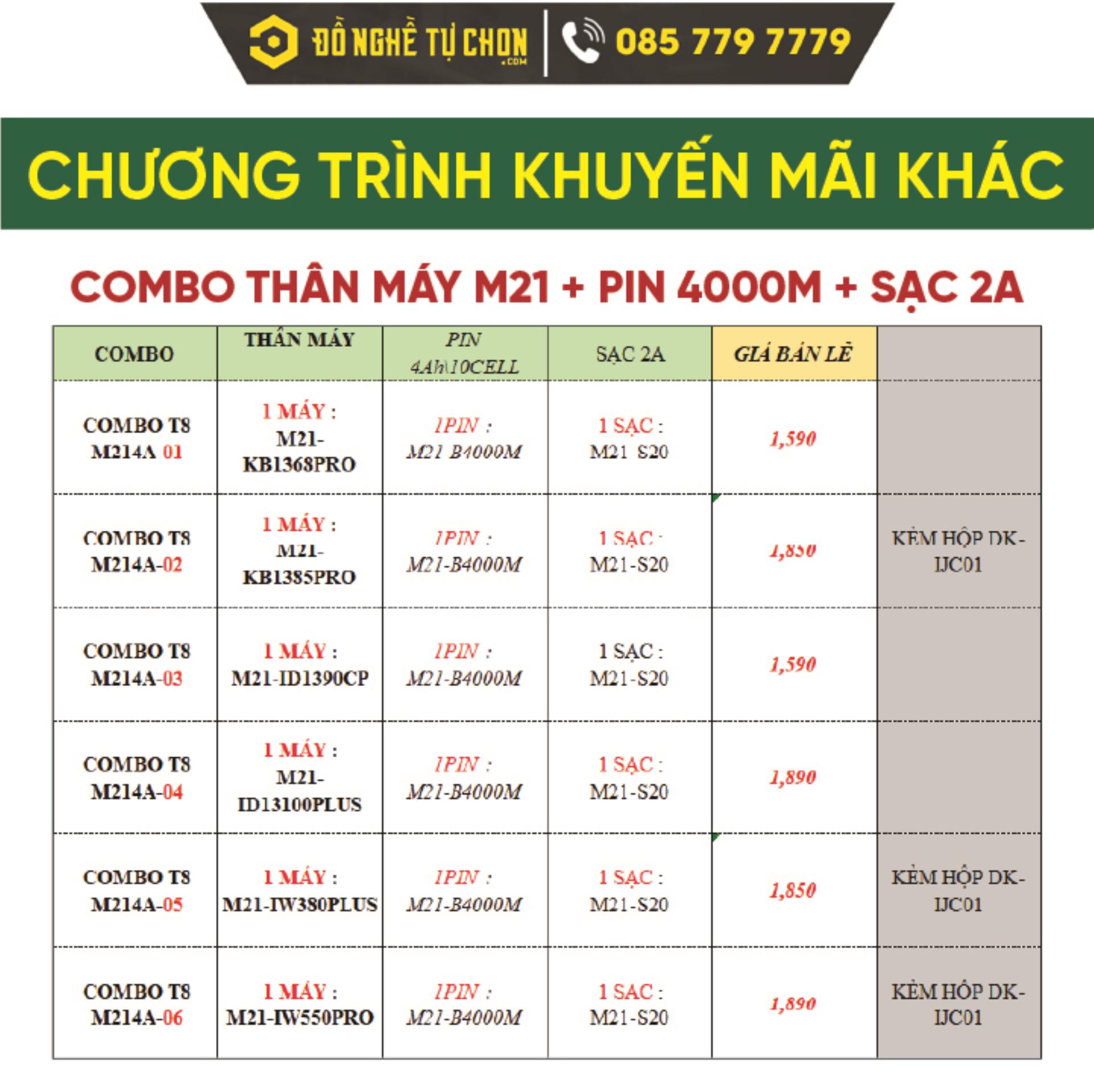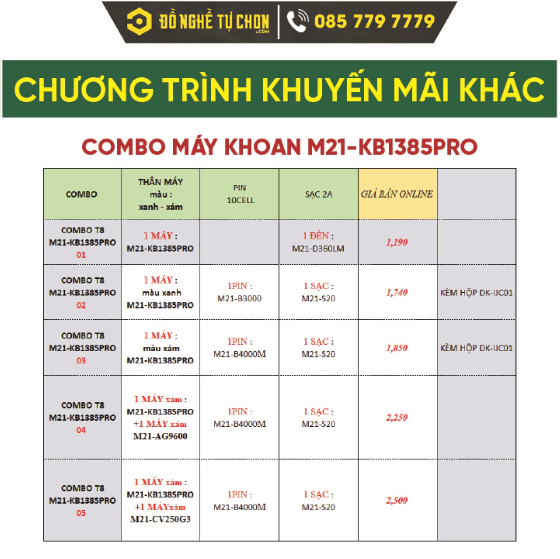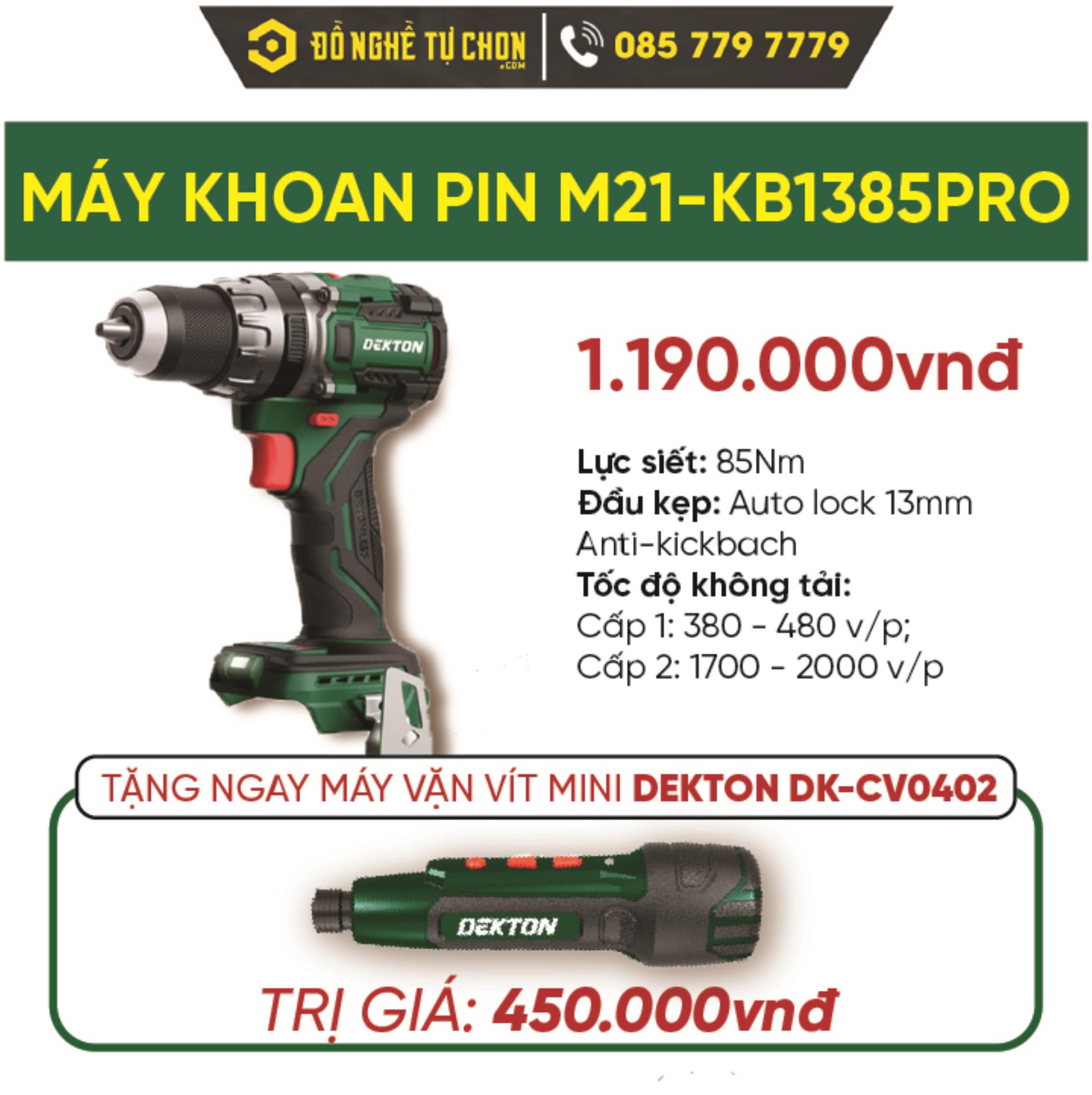 - Khi mua 01 máy M21-KB1385PRO bất kỳ, bạn sẽ nhận ngay 1 chuyên vít 4V DK-CV0402 trị giá 490.000đ. Đây là cơ hội tuyệt vời để bạn sở hữu thêm công cụ hữu ích mà không tốn thêm chi phí.
