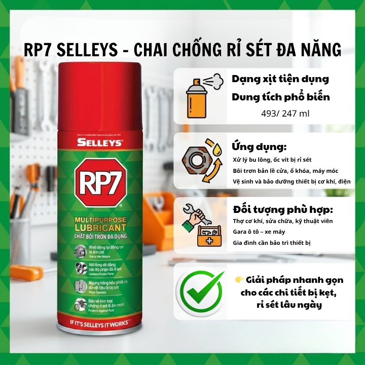 Bạn đang gặp tình trạng ốc vít bị kẹt, rỉ sét hay thiết bị hoạt động kém trơn tru? RP7 Selleys chính là giải pháp đa năng giúp bạn xử lý nhanh chóng chỉ trong vài giây.