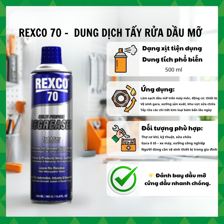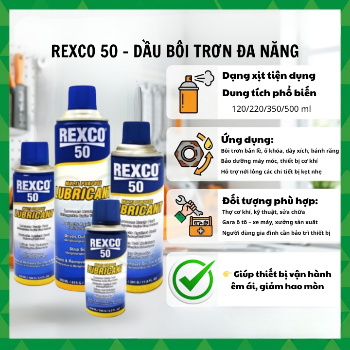 → Tùy nhu cầu: chống rỉ → RP7, bôi trơn → Rexco 50, tẩy dầu → Rexco 70, vệ sinh điện → Rexco 18.