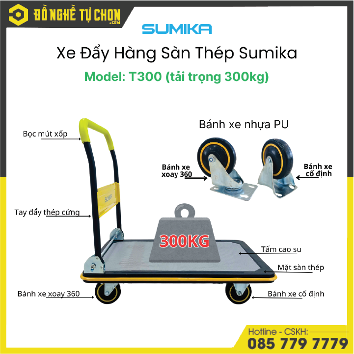 Xe đẩy hàng sàn thép SUMIKA T300 là lựa chọn lý tưởng để di chuyển hàng hóa trong kho, nhà xưởng hay siêu thị với tải trọng tối đa lên đến 300kg. Sản phẩm được trang bị tay cầm bằng thép chắc chắn, giúp người sử dụng dễ dàng điều khiển và vận hành. Sàn xe được làm từ thép bọc nhựa bền bỉ, bảo vệ hàng hóa khỏi va đập và trầy xước.